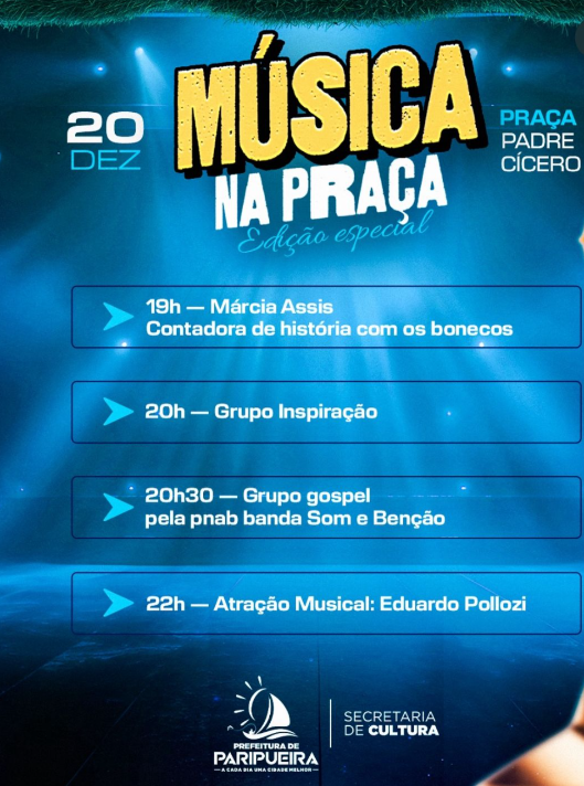 A cidade de Paripueira se prepara para viver uma noite especial de cultura, música e integração comunitária com a realização do evento “Música na Praça – Edição Especial”, marcado para o dia 20 de dezembro, na Praça Padre Cícero.