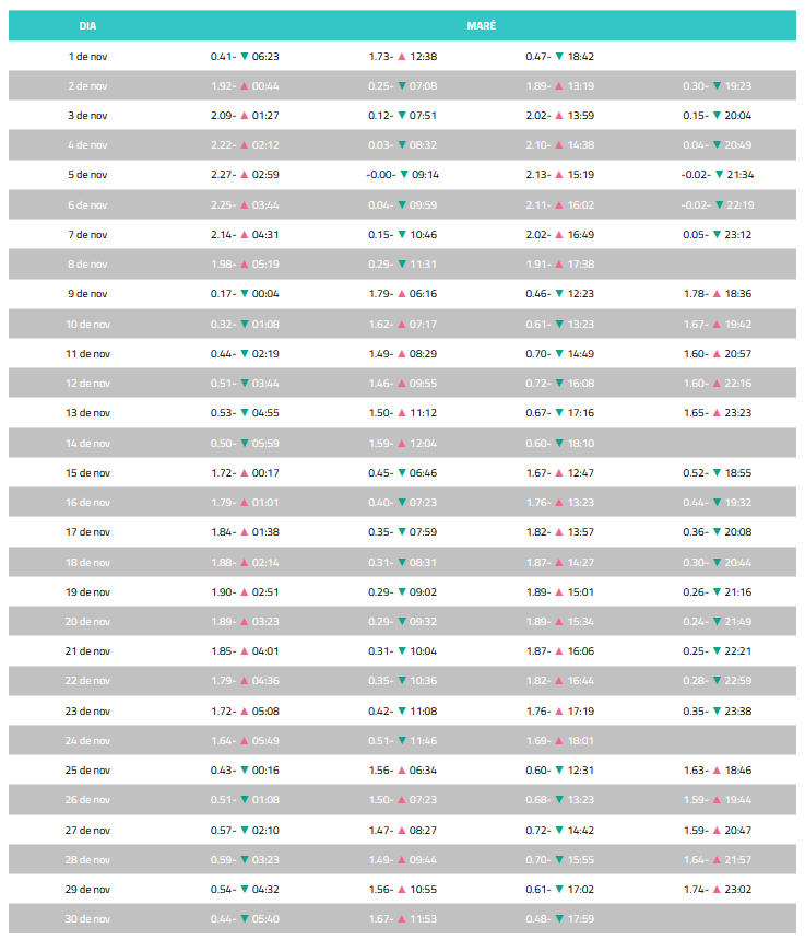 Observação: mantivemos exatamente os horários e alturas fornecidos. Onde não havia rótulo de dia, foi usado “01/11”.